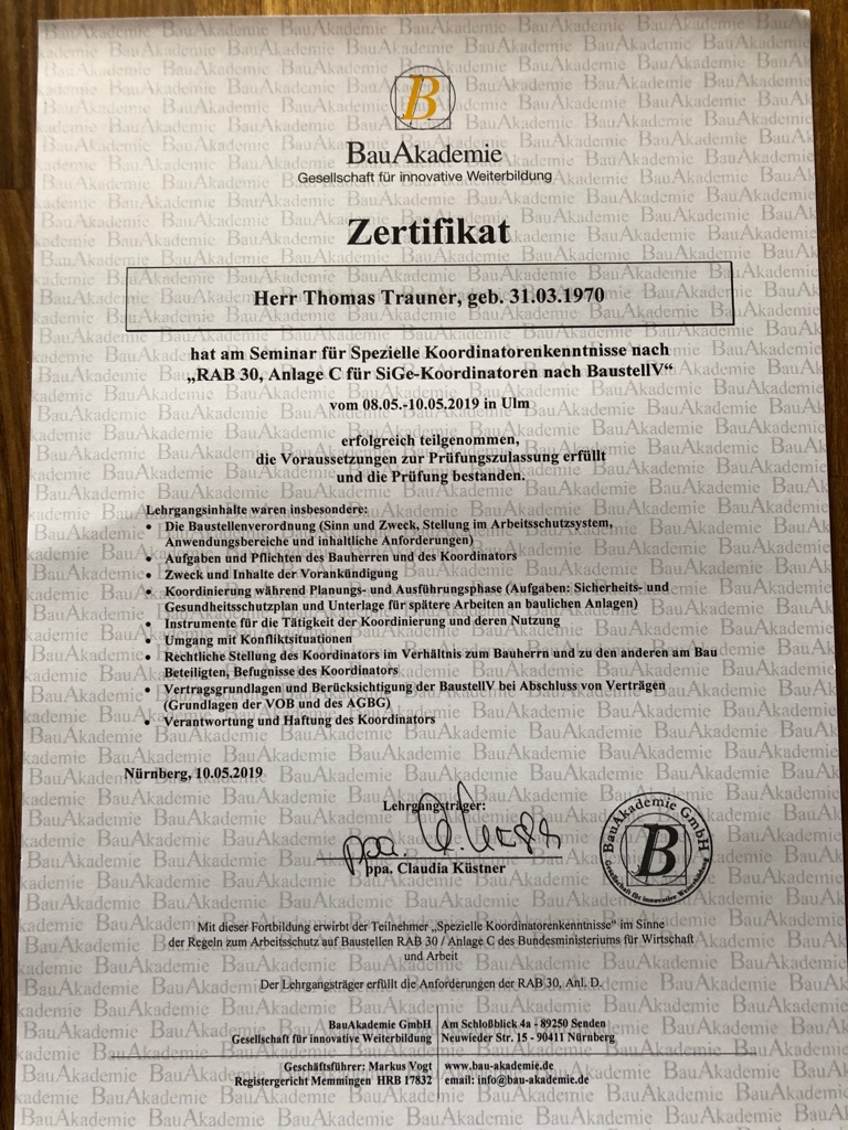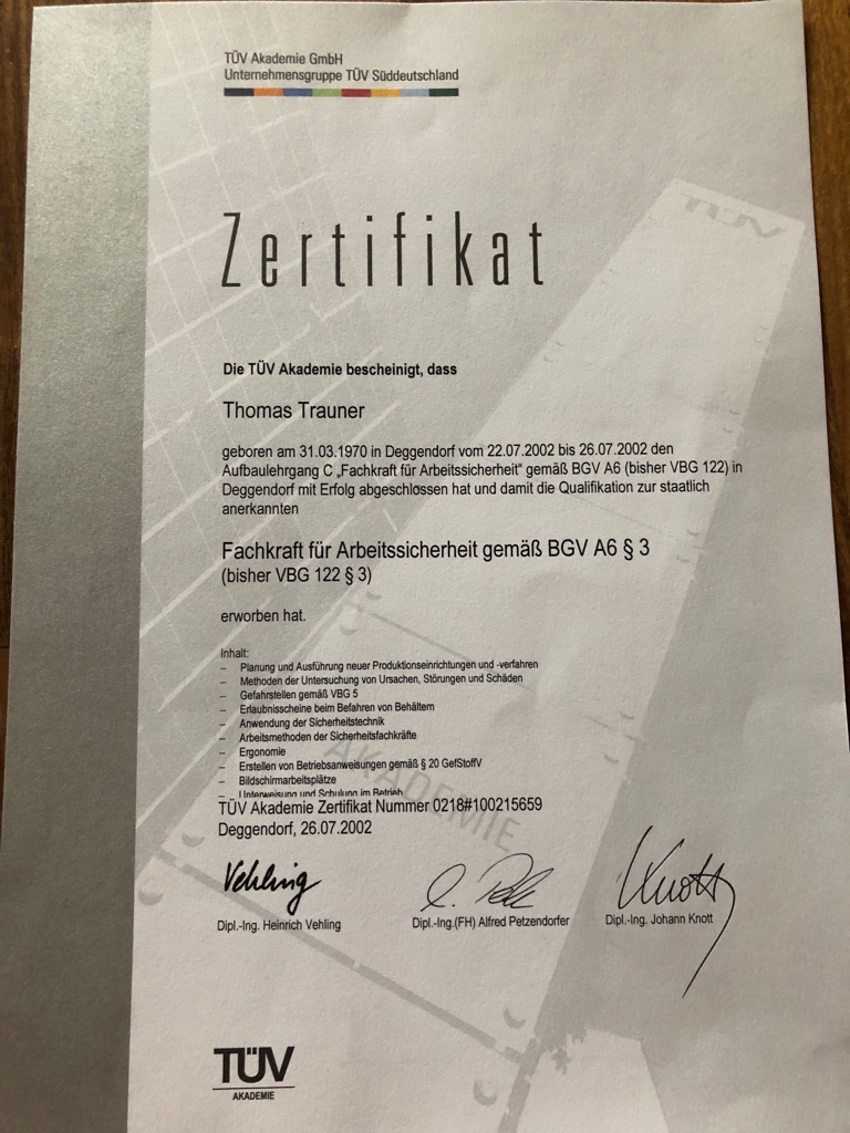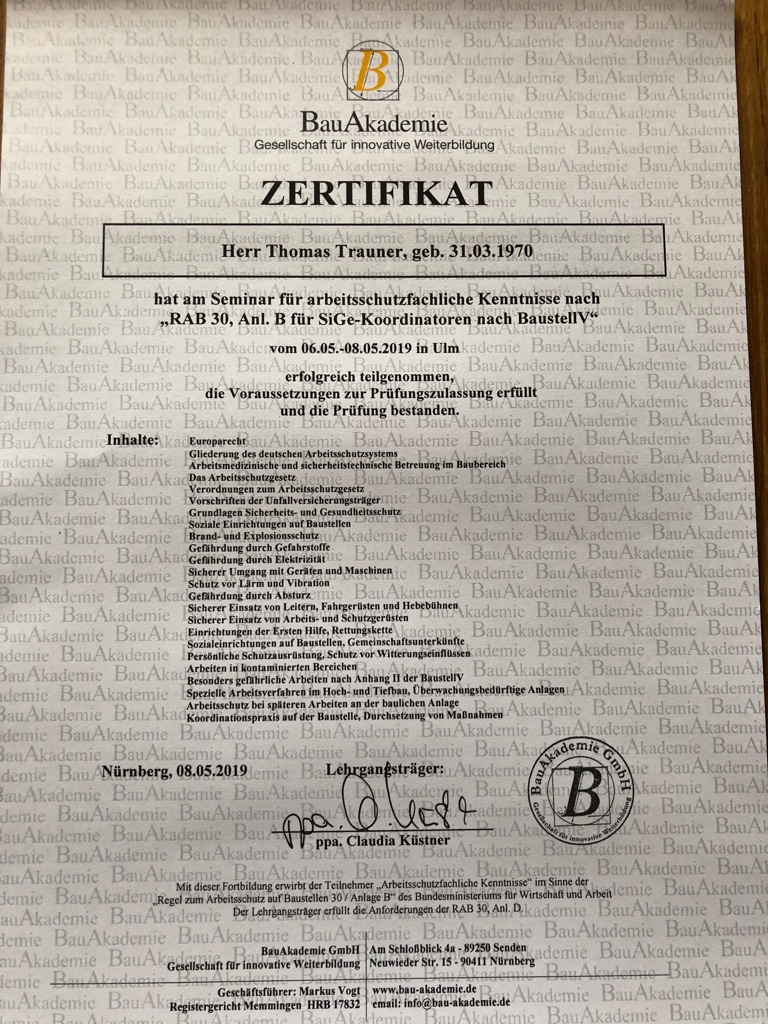 Nachfolgend finden Sie eine Übersicht meiner Qualifikationen, Zertifikate und Befähigungen in den Bereichen Arbeitssicherheit, Baustellensicherheit und Personenzertifizierung.